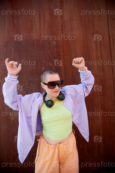 Жестокая лысая молодая женщина, танцующая на свежем воздухе против ржавой металлической стены