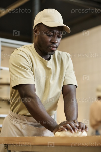 Молодой чернокожий мужчина как пекарь, kneading тесто в ремесленной булочной