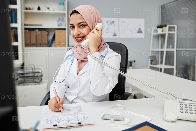 Веселый медицинский работник в платках, звонящий пациенту