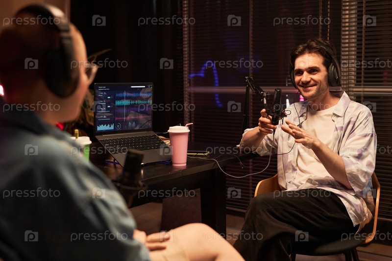 Веселый мужской блоггер разговаривает с гостем в подкастной комнате