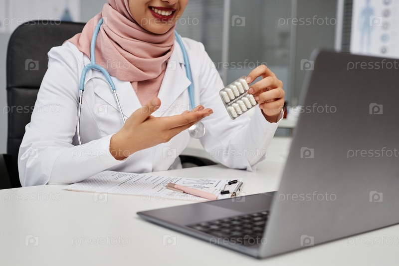 Улыбающаяся женщина врач в хиджабе держит пакет таблеток