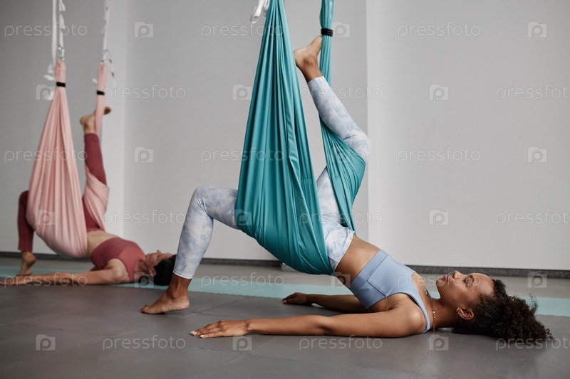 Молодая чернокожая женщина наслаждается воздушной йогой с гамаком
