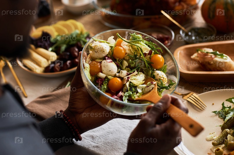 Непризнанный мужчина держит миску с обильным домашним салатом за обеденным столом
