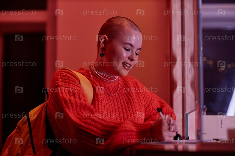 Улыбающаяся молодая женщина регистрируется в общежитии под неоновыми огнями