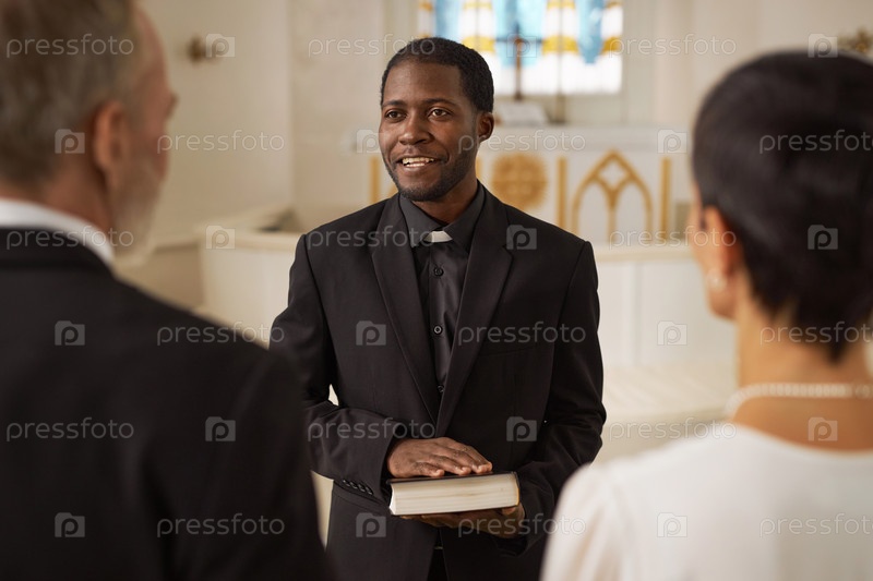Улыбающийся черный священник официализирует свадьбу в церкви и держит Библию