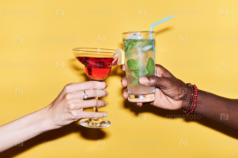 Минимальный ближайший снимок мультиэтнической пары, звучащей коктейли против желтого