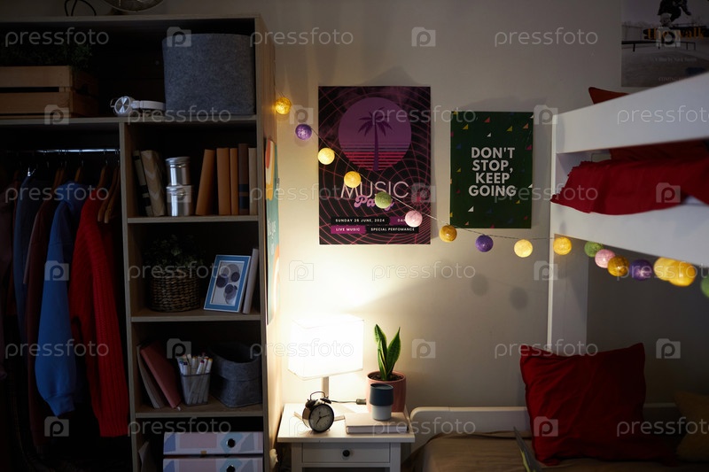 Подростковая комната с шкафчиком и забавными стеновыми украшениями