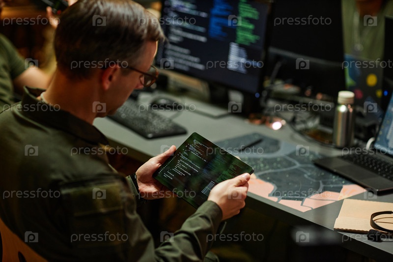 Молодой военный офицер смотрит на экран планшета в руках
