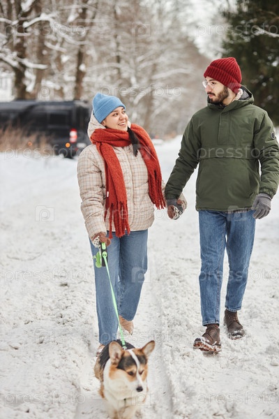 Счастливая молодая пара гуляет милым корги-собакой в зимнем лесу