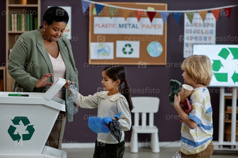 Маленькая девочка сортирует пластик на уроке переработки в дошкольном