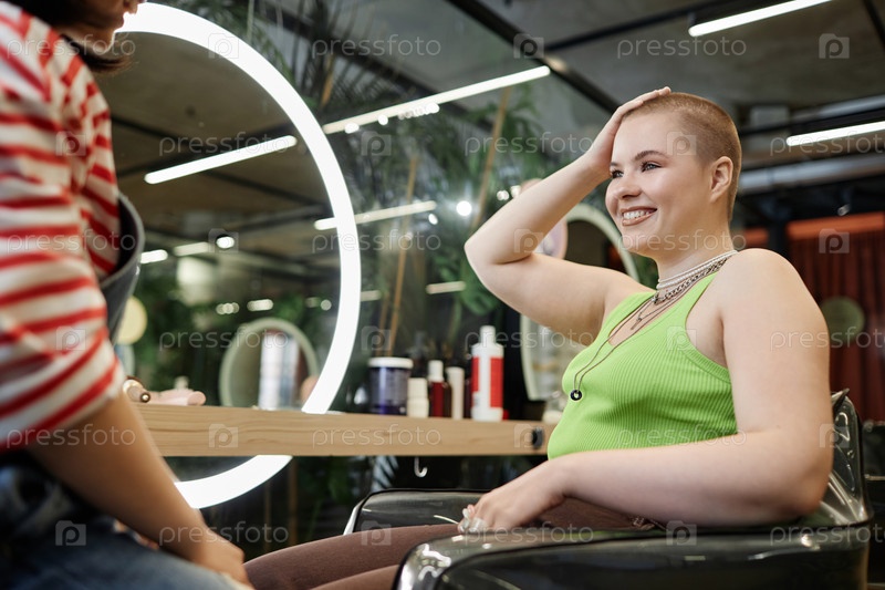Уверенная в себе молодая женщина с бузкой, улыбающаяся счастливо в салоне красоты