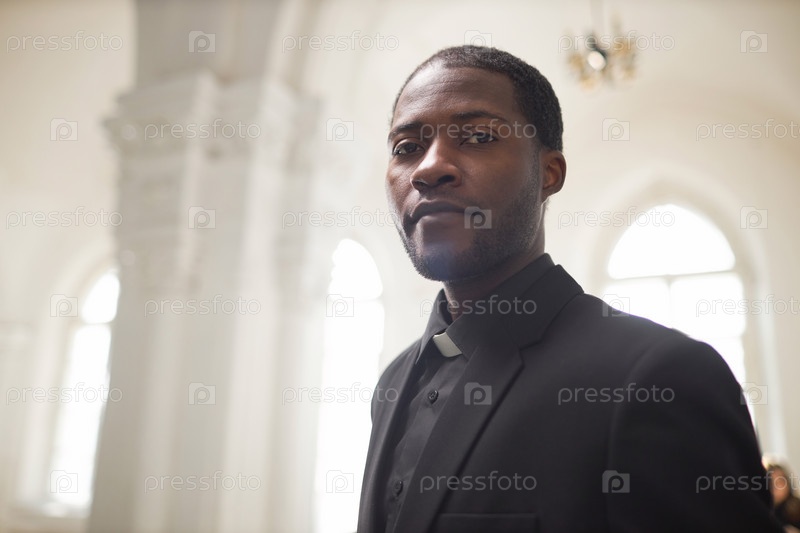 Молодой чернокожий мужчина как религиозный священник в церковной обстановке