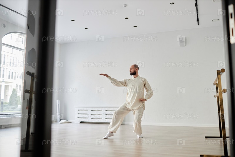 Тренер разогревается перед уроком цигун в фитнес-студии