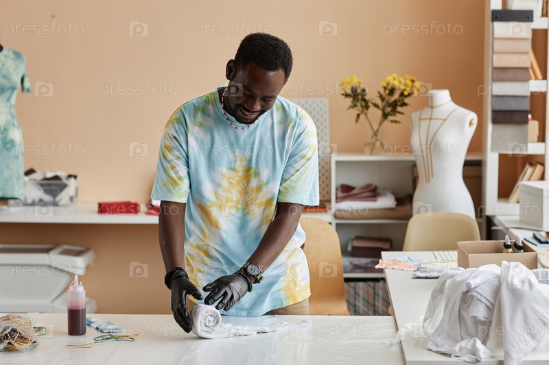 Молодой улыбающийся мужчина в защитных перчатках, катящий белую футболку на столе