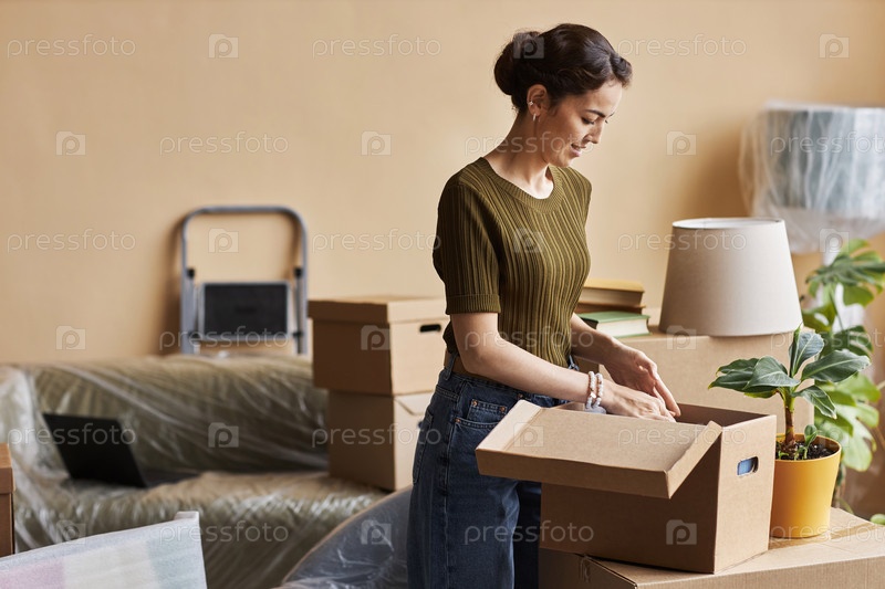 Боковой вид молодой женщины, упаковавшей или распакивавшей картонную коробку