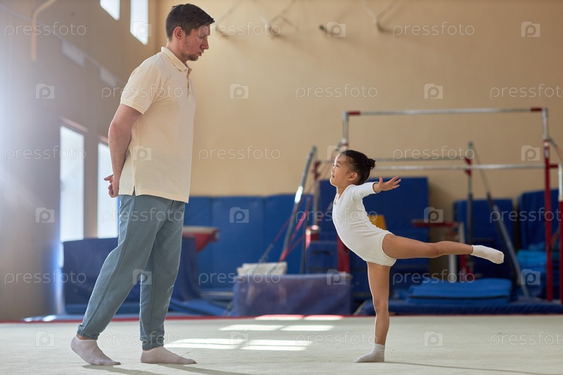 Смотреть, как гимнастка-девочка занимается арабеском