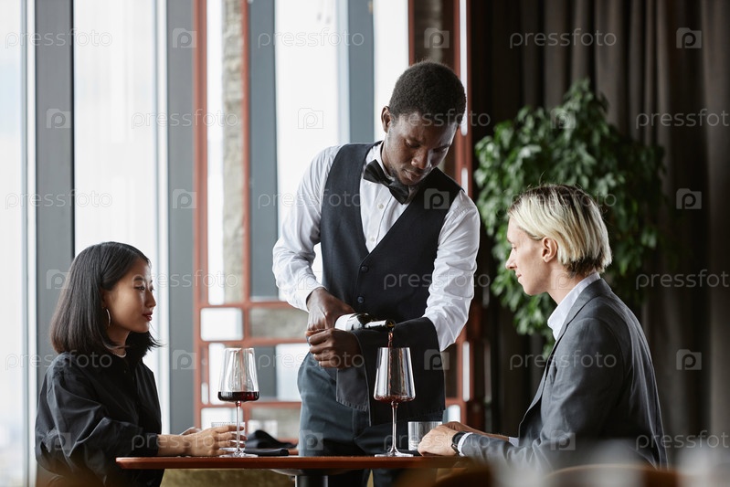 Пара наслаждается ужином в ресторане с сервером, наливающим красное вино