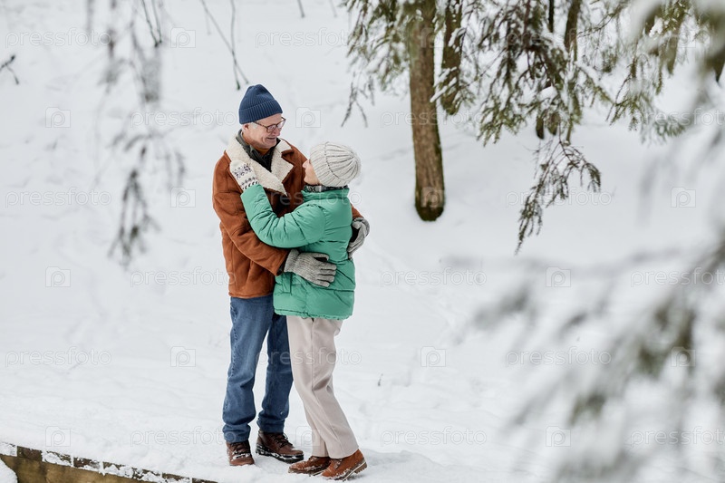 Влюбленная пара обнимается в зимнем лесу
