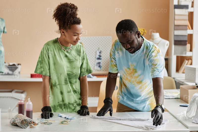 Молодая афроамериканская пара в футболках стоит за столом с повседневной одеждой