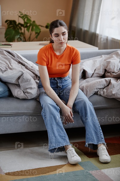 Печальная молодая женщина, сидящая утром в постели и борющаяся с депрессией