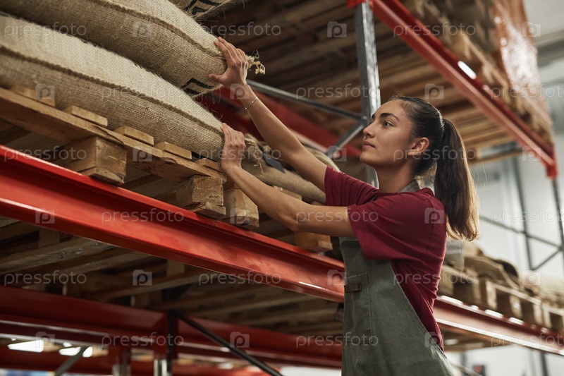 Улыбающаяся женщина работает на складе в кофеварке