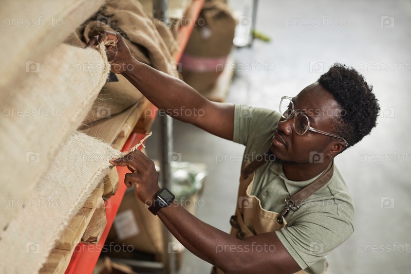 Черный мужчина доходит до кофейных пакетов на складе в кофеварке