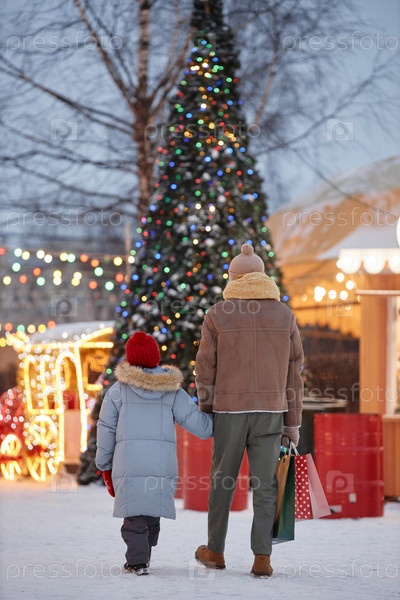 Обратный вид отца и ребенка, держащихся за руки на рождественском рынке