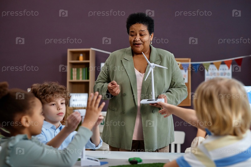 Чернокожая женщина держит модель ветряной турбины преподавательская группа детей в дошкольном возрасте