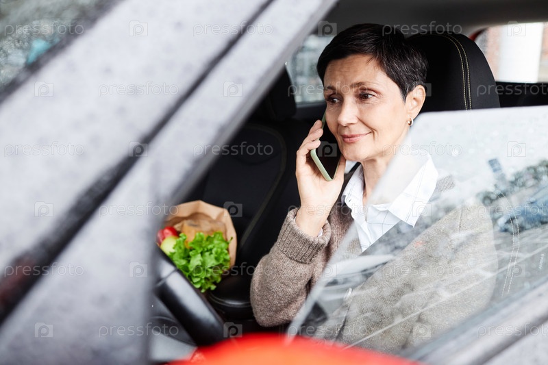 Улыбающаяся зрелая женщина, разговаривающая по телефону в машине