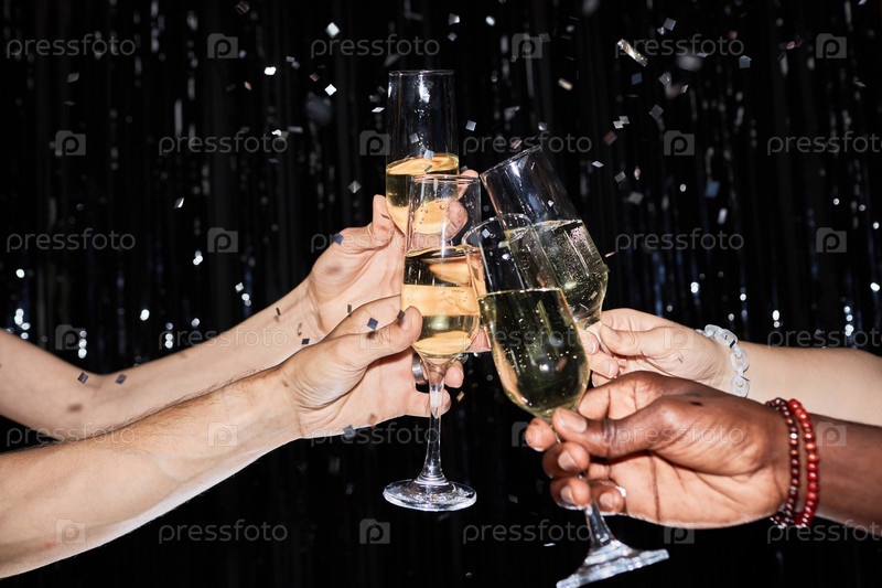 Руки, выпивающие чашками шампанского на вечеринке с конфетти