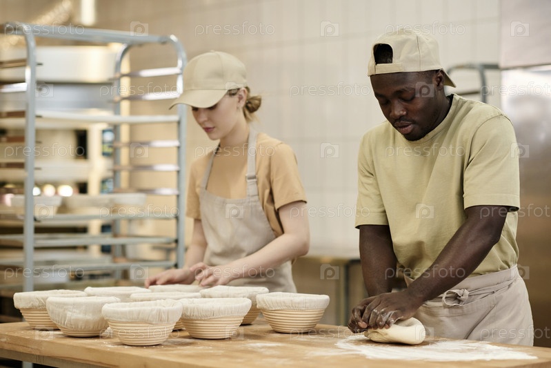 Два молодых человека, работающих в пекарне и измельчающих тесто для свежего хлеба