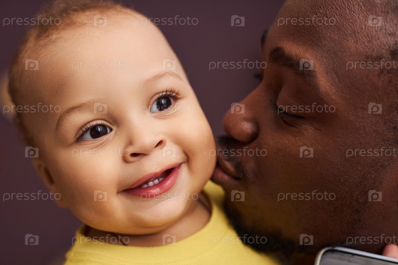 Близкий снимок любящего отца, целующего милого мальчика на щеку