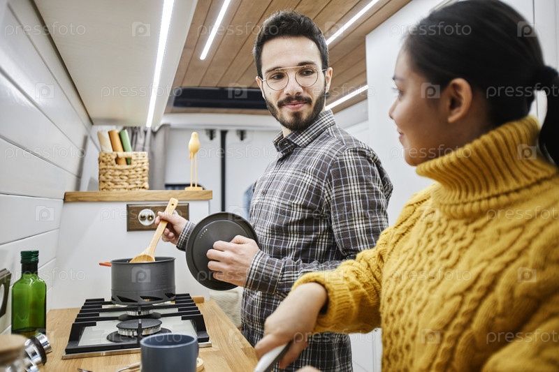 Молодая пара, готовящая вместе в фургоне-прицепе путешествуют вместе