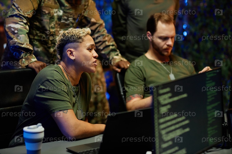 Молодая военнослужащая сидит на рабочем месте среди коллег-мужчин