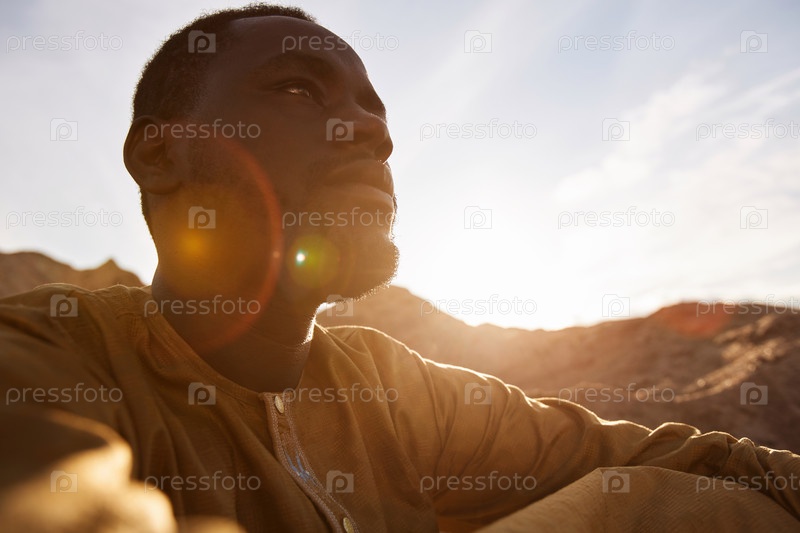 Африканский американец сидит на песчаной дюне в пустыне