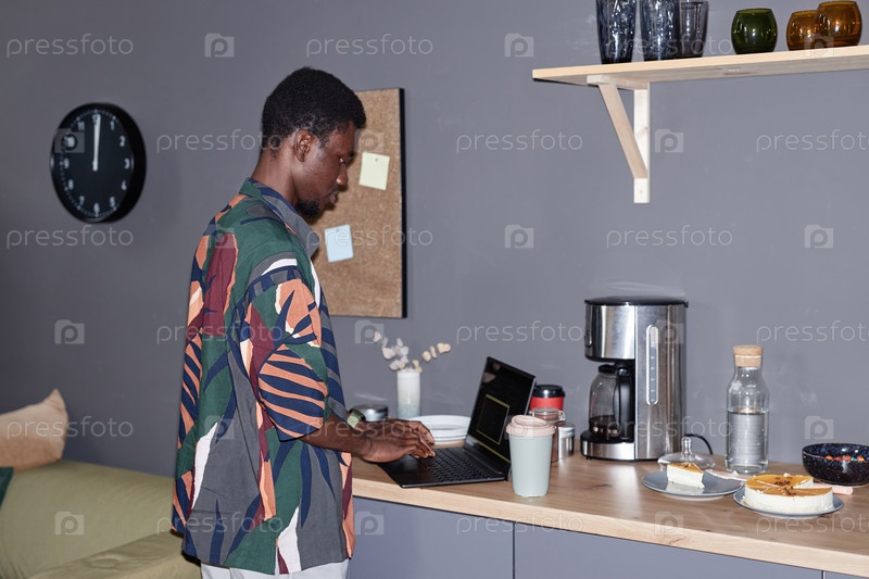 Чернокожий мужчина готовит напитки на кофейне в офисе