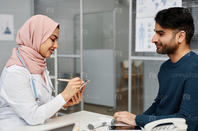 Улыбающийся мусульманский врач и пациент в кабинете клиники