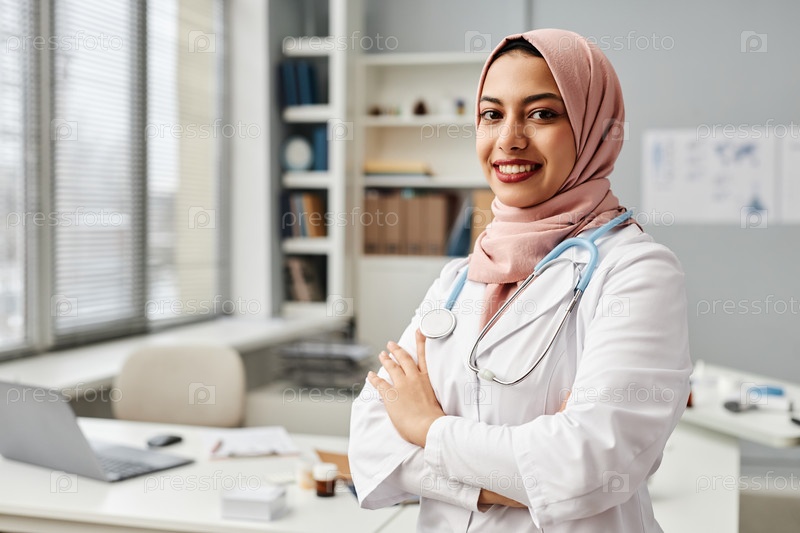 Портрет уверенного мусульманского врача в офисе клиники