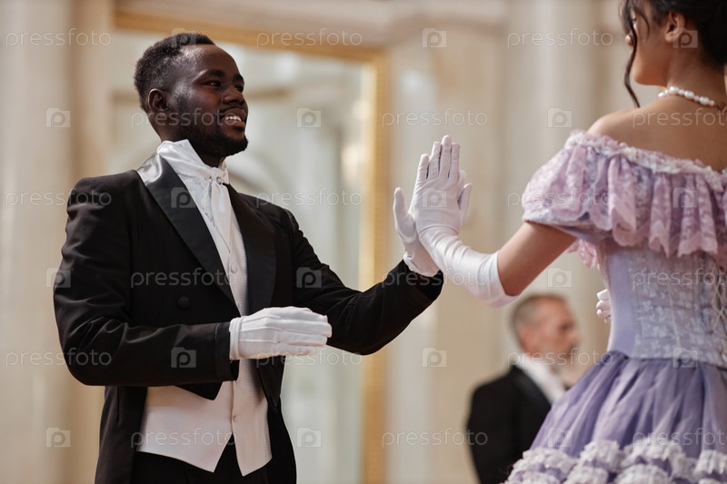 Черный джентльмен танцует с леди в бальном зале Дворца