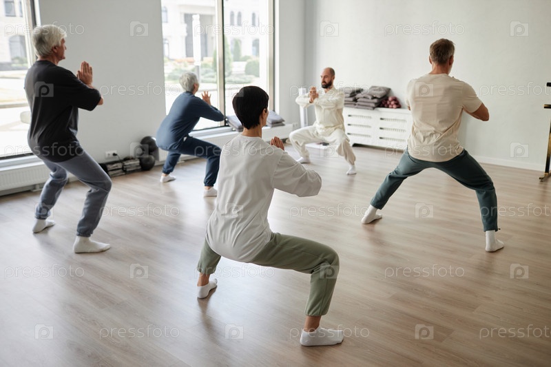 Группа пожилых людей, занимающихся спортом во время занятий йогой