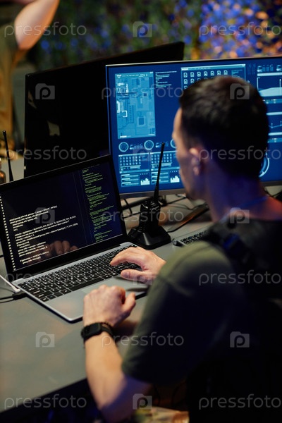 Молодой военный офицер в форме просматривает данные на экране ноутбука