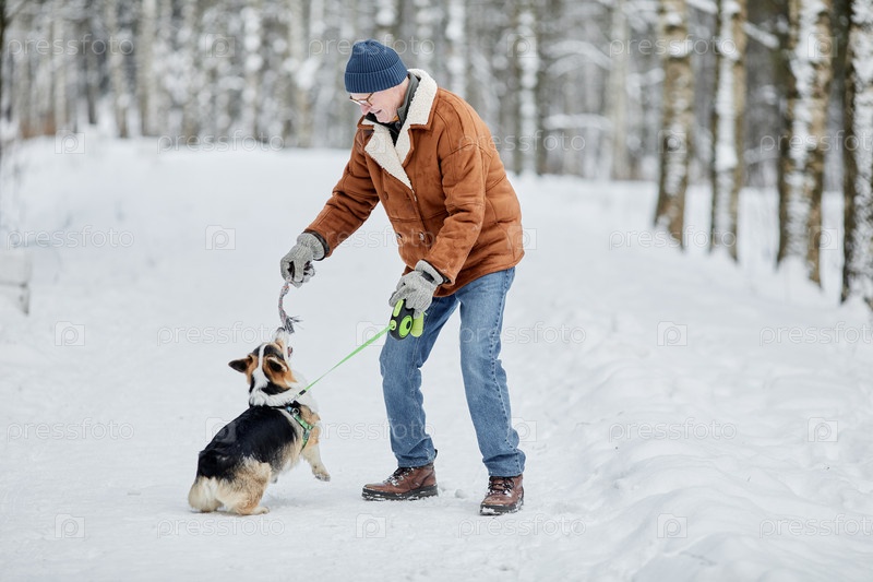 Старший мужчина играет с собакой