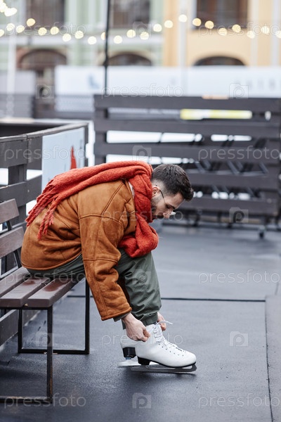 Мужчина надевает коньки на катании на лыжах