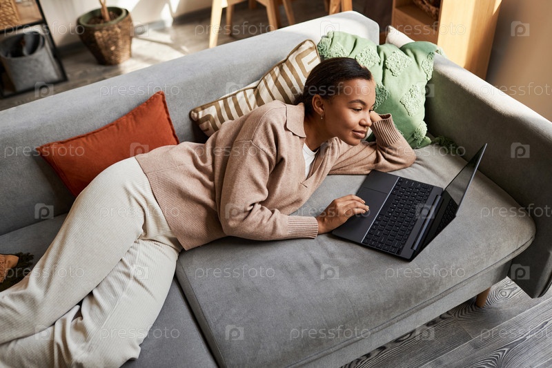 Афроамериканская девушка, лежащая на диване в уютном доме и использующая ноутбук
