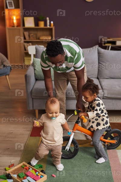 Счастливый чернокожий отец, играющий с двумя маленькими детьми в качестве заботливого stay at home папы