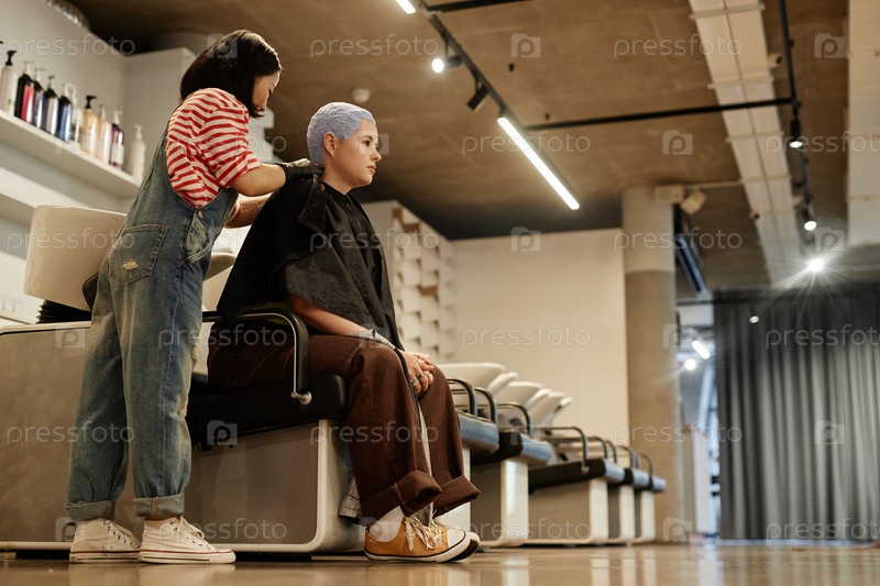 Молодая женщина с отбеленными волосами сидит в салоне, умываясь с парикмахером
