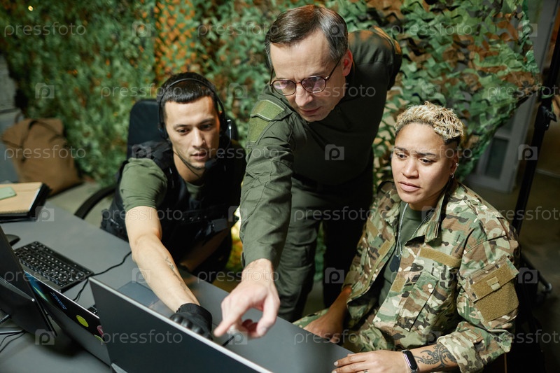 Серьезный зрелый офицер в очках и форме, указывающий на экран компьютера