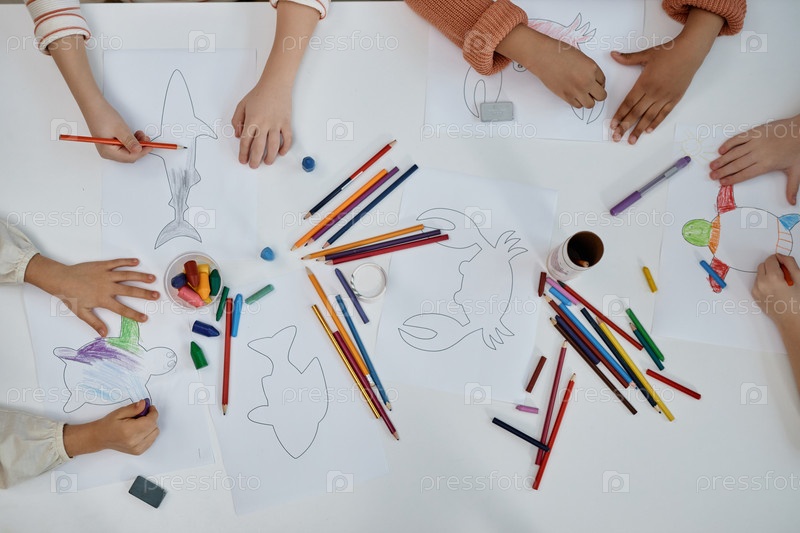 Вид сверху вблизи на многоэтнической группе детей, занимающихся искусством и ремеслом за столом