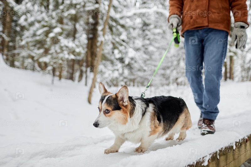 Милая корги-собака ходит на поводке