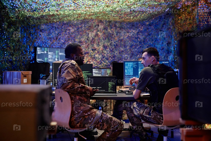 Молодой офицер в бронетехнике разговаривает с афроамериканским коллегой